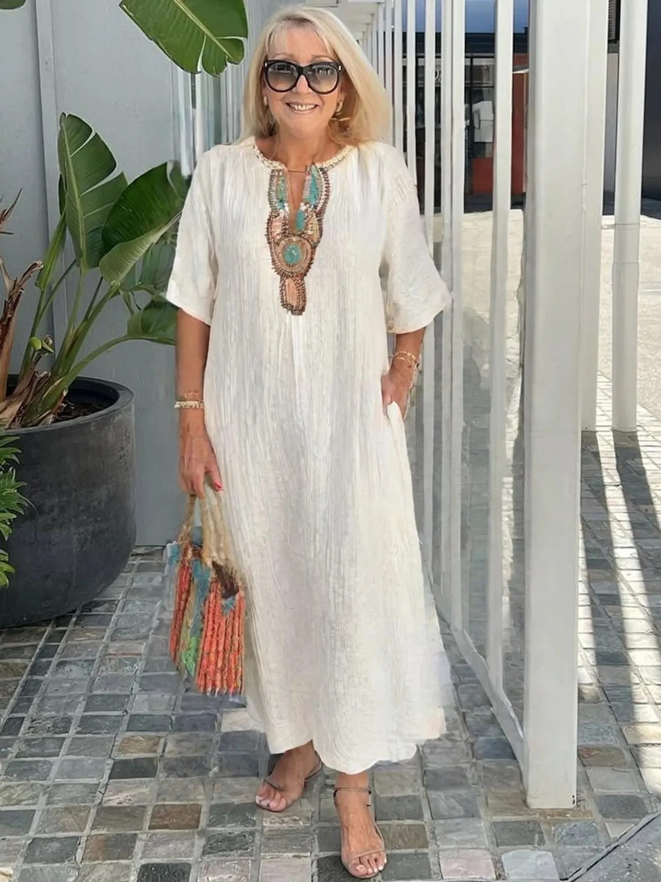 Laisse-toi séduire par cette robe d'été légère, fluide et raffinée. Conçue en lin brodé, elle respire l’élégance naturelle. Sa fente latérale subtile dévoile juste ce qu’il faut, et son tissu doux garantit un confort absolu même sous la chaleur estivale.