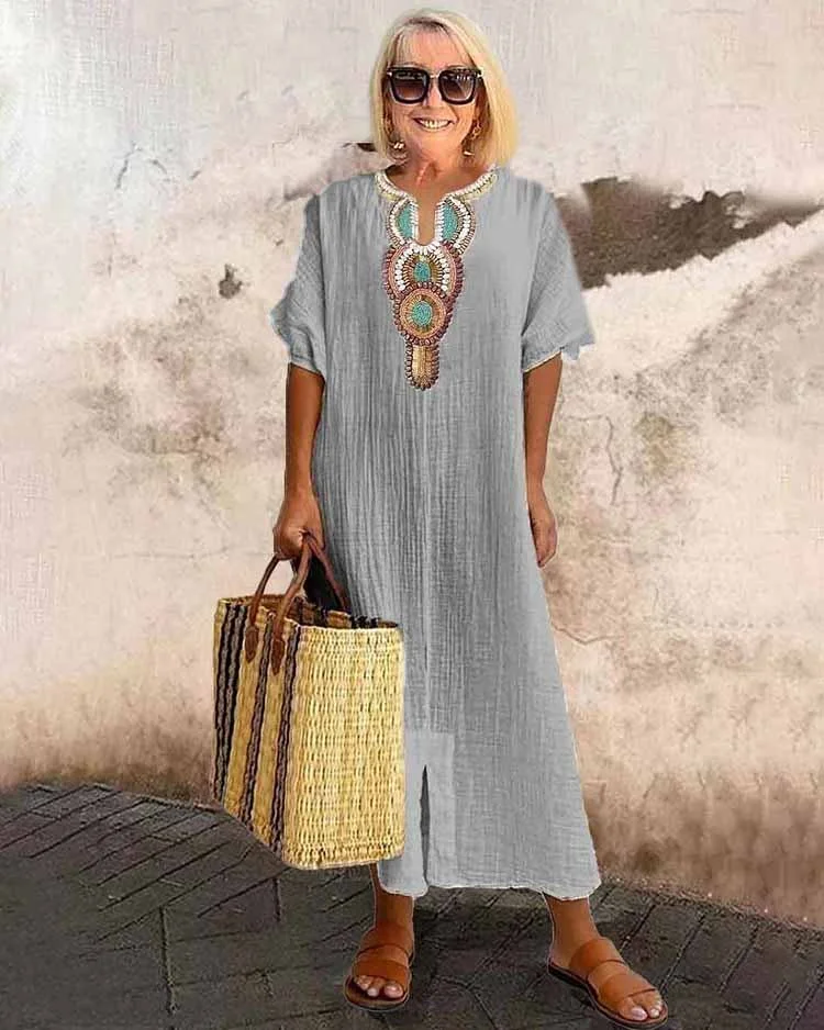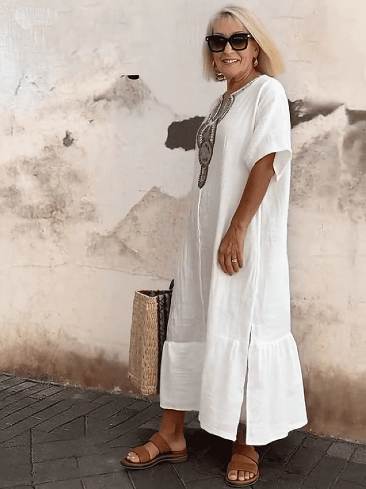 Robe Longue Fendue en Lin Brodé – Élégance Naturelle & Fraîcheur d’Été